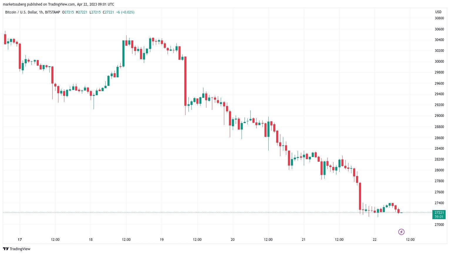Data from Cointelegraph Markets Pro and TradingView showed BTC/USD barely preserving the $27,000 mark on April 22 after the Wall Street trading week ended on a sour note.
