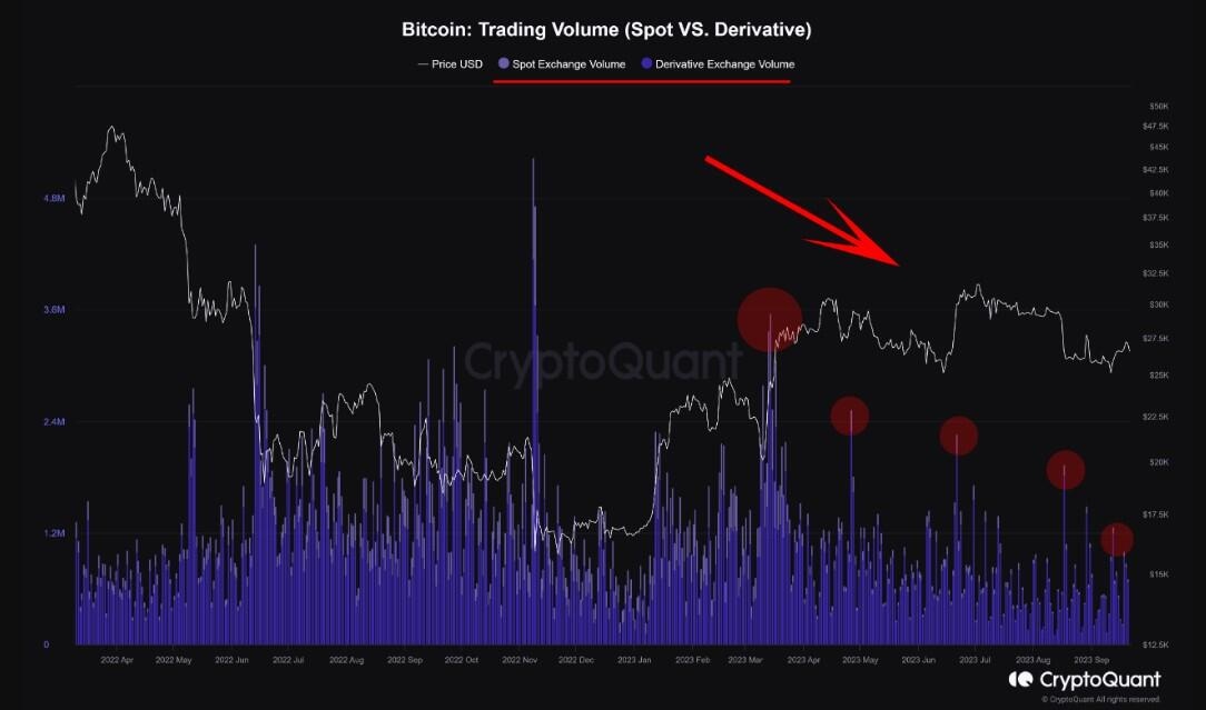 Data by on-chain market intelligence CryptoQuant shows that Bitcoin trading volume in spot and derivatives markets has witnessed a significant drop beginning March 2023. The derivatives or futures market is down 73% since the onset of the year whilst the spot market is down 94%.