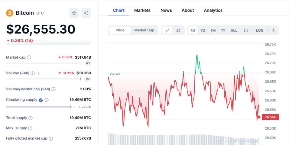 At the time of writing, Bitcoin price is $26,591.