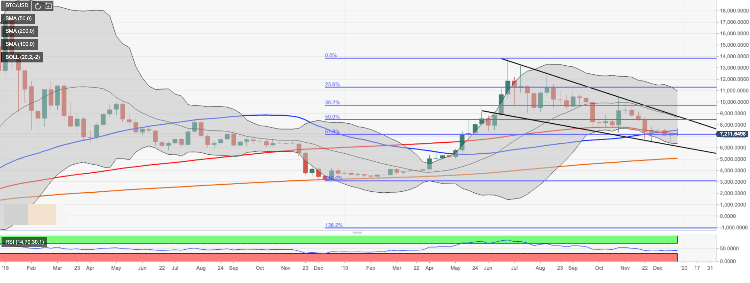 During X-mas week, Bitcoin oscillated in a range limited by $7,700 on the upside and $7,000 on the downside. Recovery attempts have been limited so far, though Bitcoin's market share increased to 68.9% as major altcoins were struggling even more.