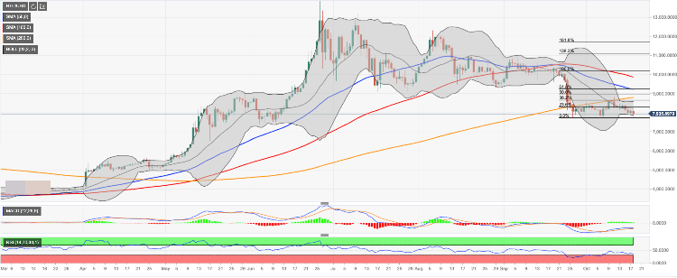 On the upside, we will need to see a sustainable move at least above $8,200 ( the middle line of the daily Bollinger Band) to mitigate the initial bearish pressure. The next important resistance is created by the weekly high marginally above $8,400. Once it is out of the way, the upside is main gain traction with the next focus on $8,600 and the ultimate barrier created by SMA200 daily on approach to $8,800.