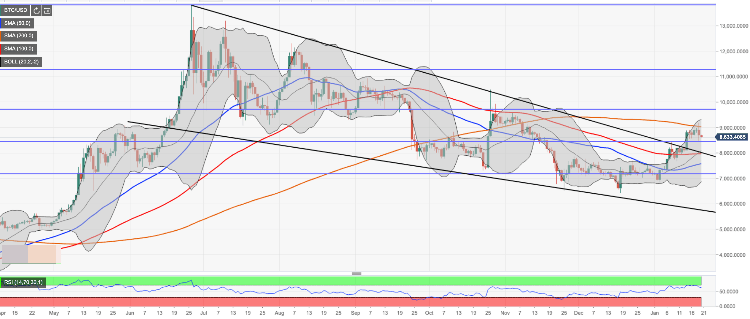 On the downside, BTC will need to stay above $8,500 to retain the bullish bias. If this support area is sustainably broken, the sell-off pressure will intensify with the next bearish aim at a psychological $8,000 reinforced by the broken upper boundary of the wedge formation.