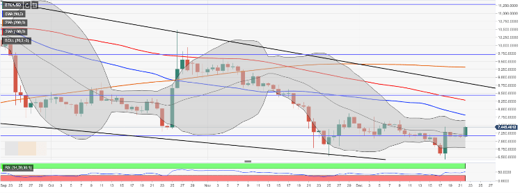 Bitcoin (BTC) recovery has gained traction on Sunday. The first digital coin is changing hands at $7,435 at the time of writing; however, the upside momentum remains strong, which means Asian traders may wake up on Monday to see bitcoin and a new December high. BTC/USD has grown by 3.5% on a day-to-day basis and 4% since the beginning of the day.