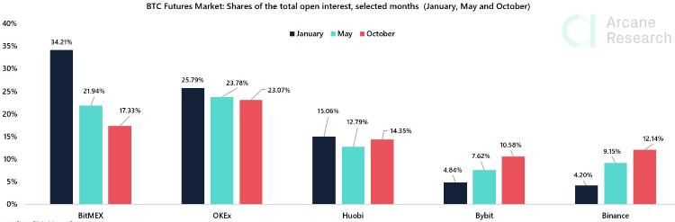 Since the beginning of the year, BitMEX's share on the Bitcoin futures market dropped from 36.9% до 16.8% as the place has become more crowded. There are currently five exchanges holding over 10% of the total OI in the BTC futures market. OKEx is the biggest one with a market share of $23, BitMEX sits in the second position with nearly 17%.