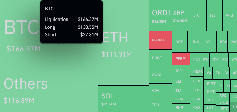 As news of the report broke, Bitcoin price retracted almost 7%, and with it, altcoins, causing up to $540 million in total liquidations across the market within a four-hour span. For Bitcoin, up to $166.37 million positions were liquidated, comprising $138.55 million longs against $27.81 shorts. This means that up to $373.63 million altcoin positions were liquidated, marking the largest altcoin liquidation event in two years.