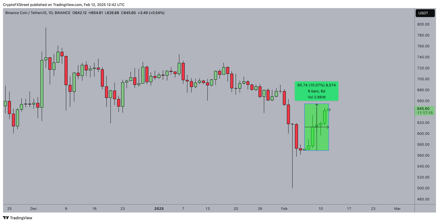 BNB's price rally began on February 6, when it opened at $569. Since then, it has gained 15%, hitting $654 on Wednesday.