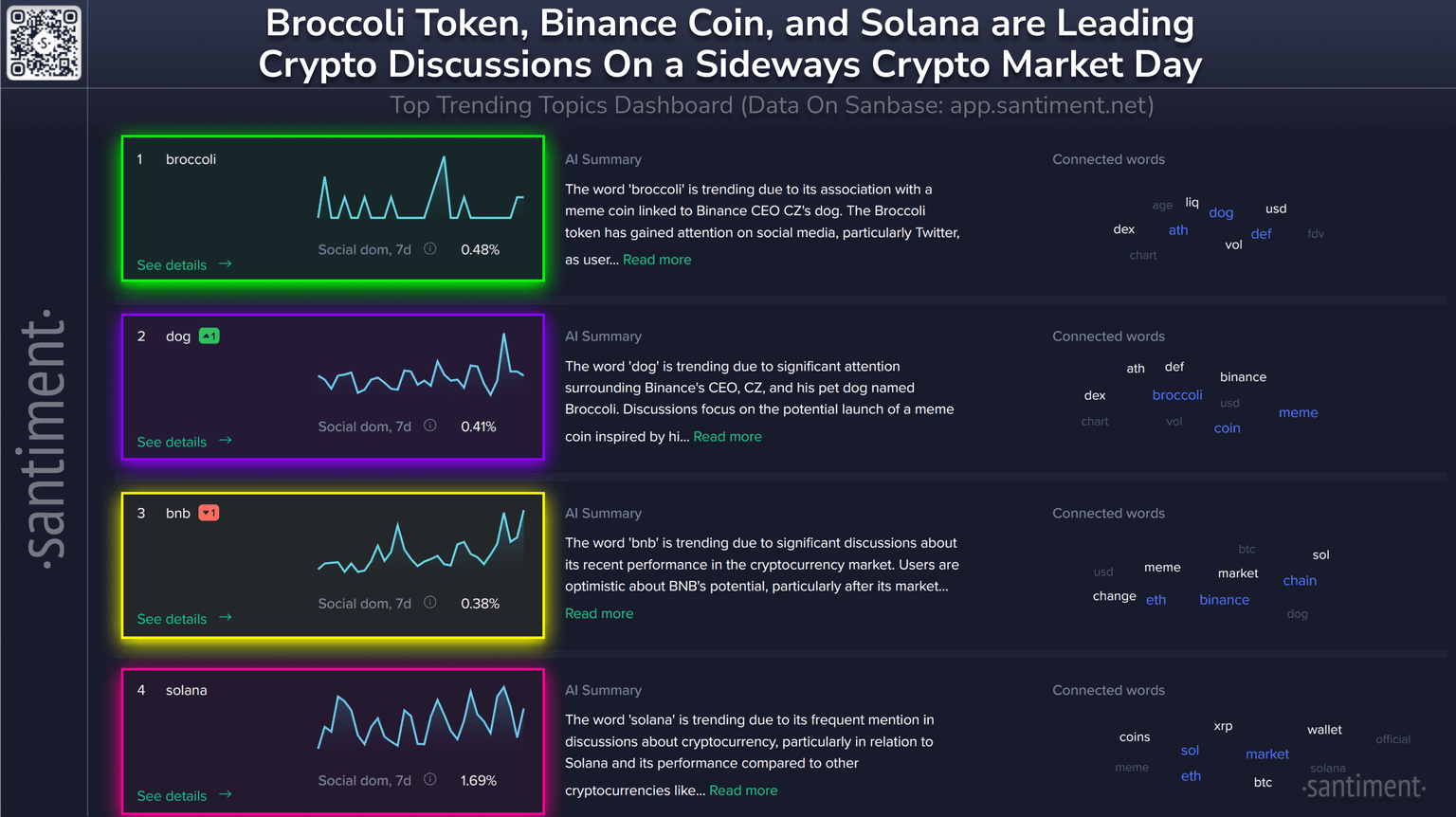 Santiment data shows that Broccoli is trending due to its association with a meme coin linked to the dog owned by the former CEO of Binance, Changpeng Zhao. The Broccoli token has gained attention on social media, particularly X, as users discuss its recent purchase surge, market capitalization, and trading volume. This excitement has sparked broader conversations about meme coins, with mentions of trading and investment opportunities on platforms like Binance Smart Chain.