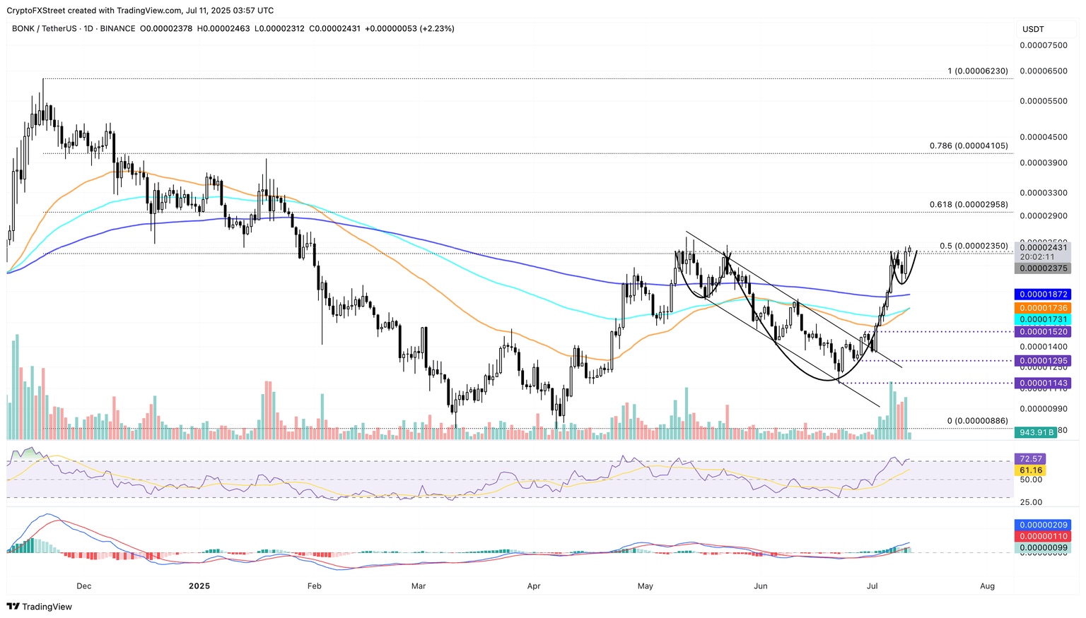As BONK exceeds the neckline, it also surpasses the 50% Fibonacci retracement level at $0.00002350, which is retraced between the November 20 high of $0.00006230 and the April 7 low of $0.00000886.