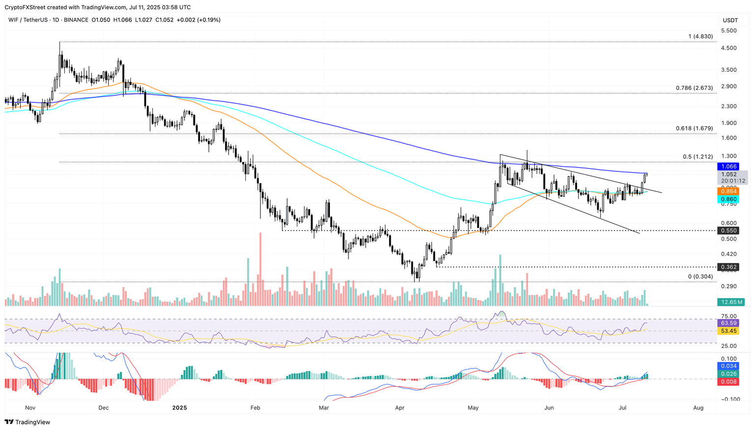 Dogwifhat reclaims the $1.00 round figure and edges higher to challenge the 200-day EMA at $1.066. The declining broadening wedge breakout in WIF upholds momentum with its third consecutive bullish candle.