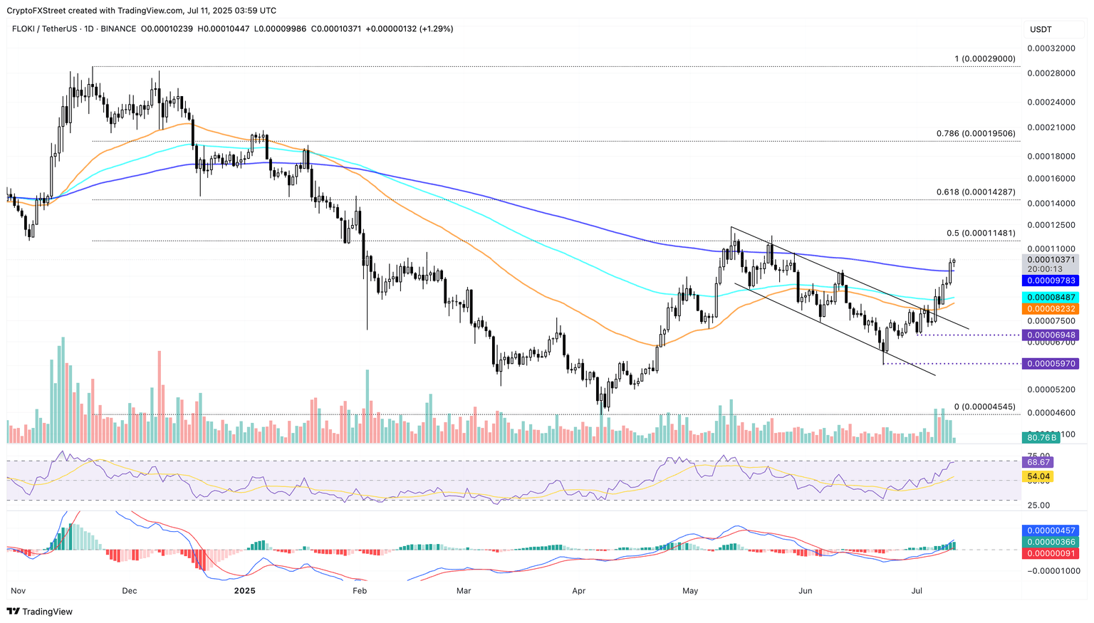 Floki’s channel breakout rally exceeds the 200-day EMA and reclaims the $0.0001000 psychological level. The uptrend now aims to surpass the 50% level at $0.0001148, retraced from $0.0002900 on November 21 to $0.0000455 on April 7, marking a potential trend reversal.