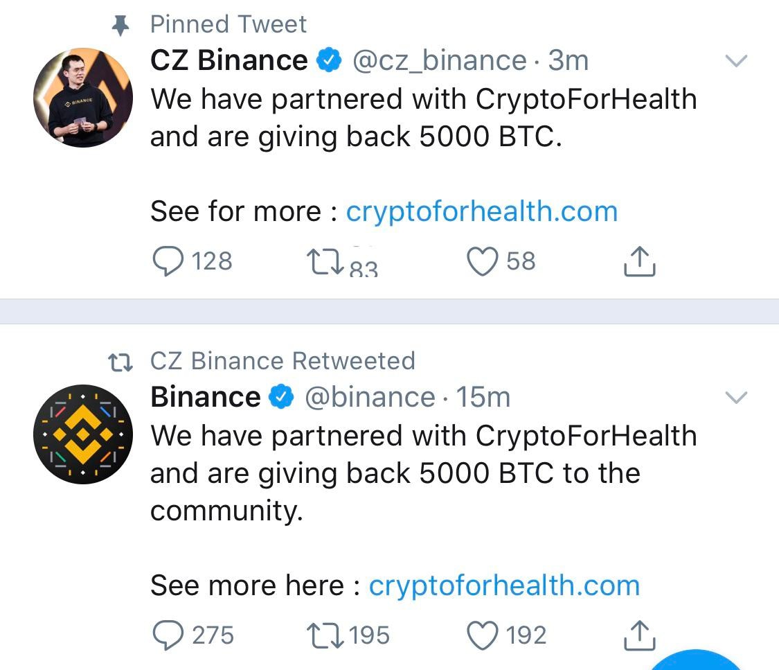 They are all posting a link to the same website named 'cryptoforhealth' stating that they have partnered with that platform and are giving back 5000 BTC to the community. Of course, many people are falling for the scam as it is from official accounts all around Twitter. The list now includes:
