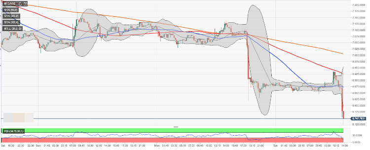 Bitcoin (BTC/USD) has resumed the decline during early US hours. The first cryptocurrency hit the low of $6,720 before recovering to $6,780, at the time of writing.