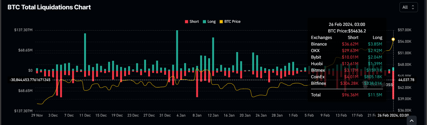 Nevertheless, with the foray past $54,000, $96.36 million in short positions have been liquidated alongside $11.5 million longs.