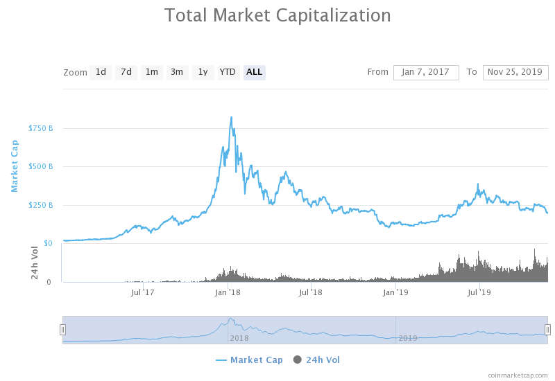 Far from the heady, halcyon days of late 2017, the cryptoasset markets are far tamer and more grounded as of writing in December 2019. After peaking above $800B at the start of 2018, the overall market capitalization of all the tokens in circulation has fallen to roughly $200B.