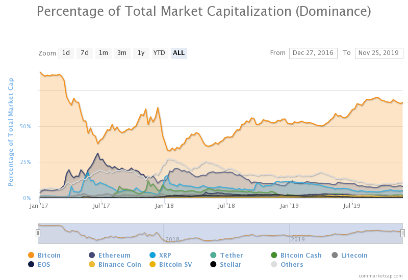 As the chart above shows, Bitcoin now represents about two-thirds of the overall cryptoasset market capitalization, with rivals such as Ethereum, Ripple (XRP), and Bitcoin Cash losing market share. Generally speaking, the above chart can serve as an indicator of so-called “alt seasons”: when Bitcoin’s dominance is trending higher, crypto traders prefer to hold Bitcoin itself, whereas a turn lower in Bitcoin could signal that altcoins are poised to outperform.