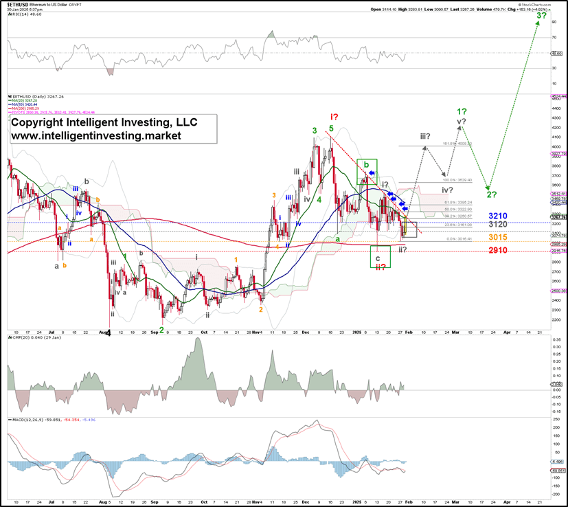 However, this EWP count does require confirmation by price breaking above the downtrend line it has been under since December 16 (see the blue arrows) followed by a move above the (blue) 50-day simple moving average (now at $3420). Lastly, we also want to see it move above the red, down-sloping Ichimoku cloud. Those parameters will tell us Ethereum is back in an uptrend. Thus, we keep the question marks on the labels for now.