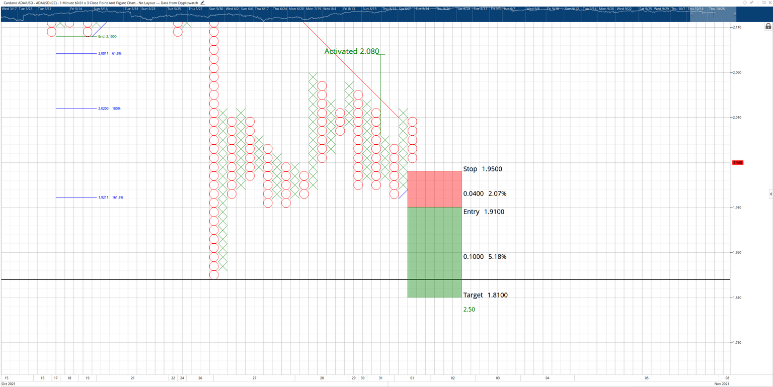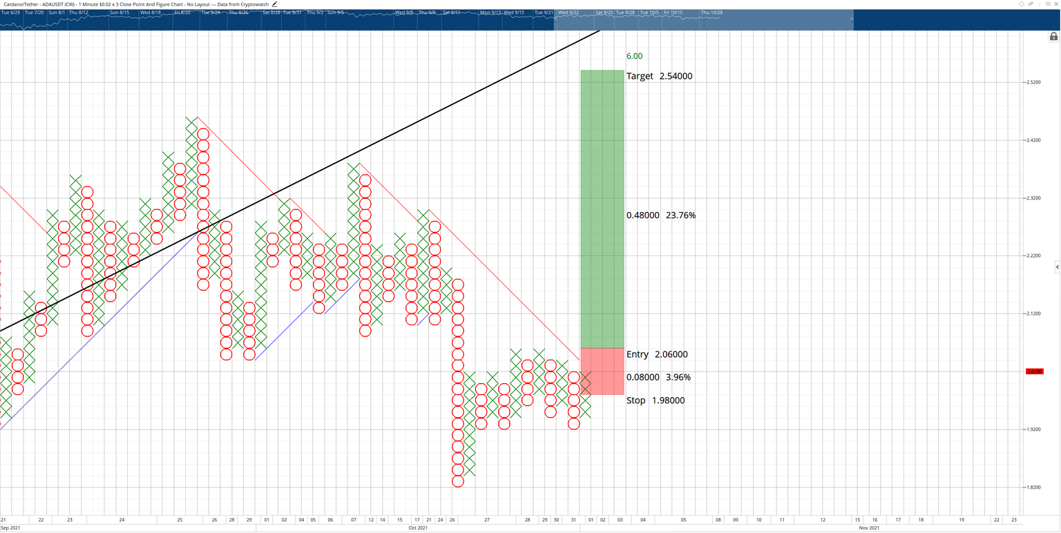 Cardano price has a potential long setup with a buy stop of $2.06, a stop loss at $1.98, a profit target at $2.54. The profit target is based on the Horizontal Profit Target Method in Point and Figure analysis. The entry itself accomplishes two bullish conditions at the same time. First, the entry breaks the bear market angle and converts the Point and Figure chart into a bull market. Second, the entry would confirm the bullish pattern known as a Bear Trap.
