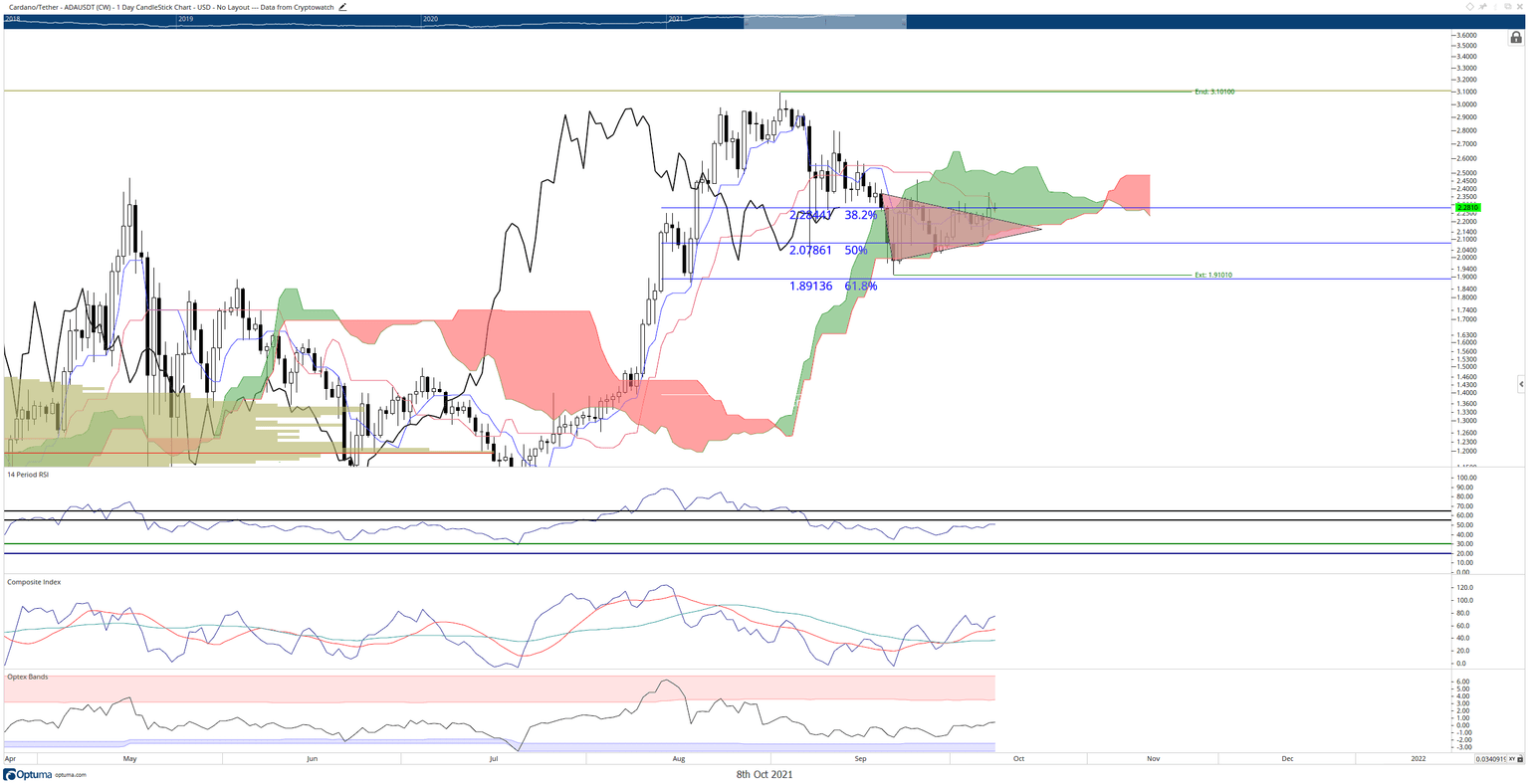 Cardano price has been highly consistent over the four daily trading sessions. It had been trading inside a bearish continuation pattern known as a bearish pennant but failed to break down below that pattern. Instead, price broke above and closed above the pennant on Thursday. More importantly, the Thursday close positioned the Friday open above the 38.2% Fibonacci retracement and the daily Kijun-Sen.