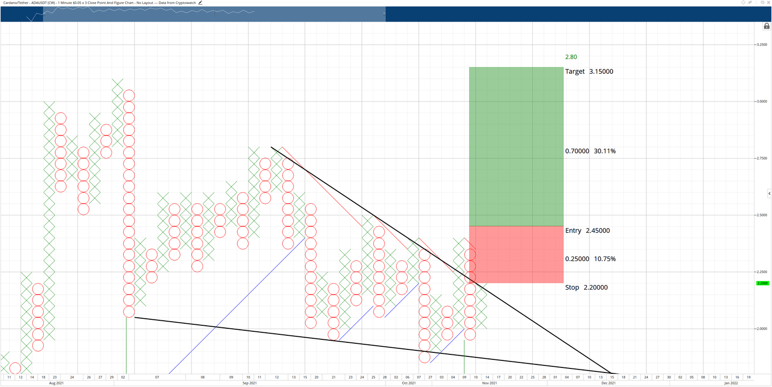 Cardano price has an ideal, theoretical long entry idea on the break of a Split Triple-Top pattern on its $0.05/3-box Point and Figure Chart. The long idea is a buy stop at $2.45, a stop loss at $2.20 and a profit target at $3.15. The strength of this long idea is based on another factor besides the breakout above a triple-top: price returning above the falling wedge pattern. A three-box trailing stop could help protect any potential profit generated.