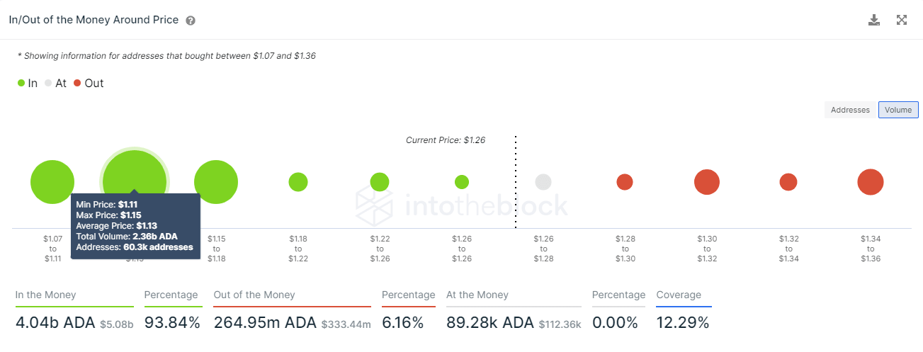 The lack of significant support areas ahead of $1.1 on IntoTheBlock's In/Out of the Money Around Price (IOMAP) model reinforces the view that ADA could edge lower toward that area in the near-term. However, the chart shows that 2.36 billion ADA at an average price of $1.13 had been acquired by 60,300 addresses, suggesting that ADA will have a difficult time dropping below that level.
