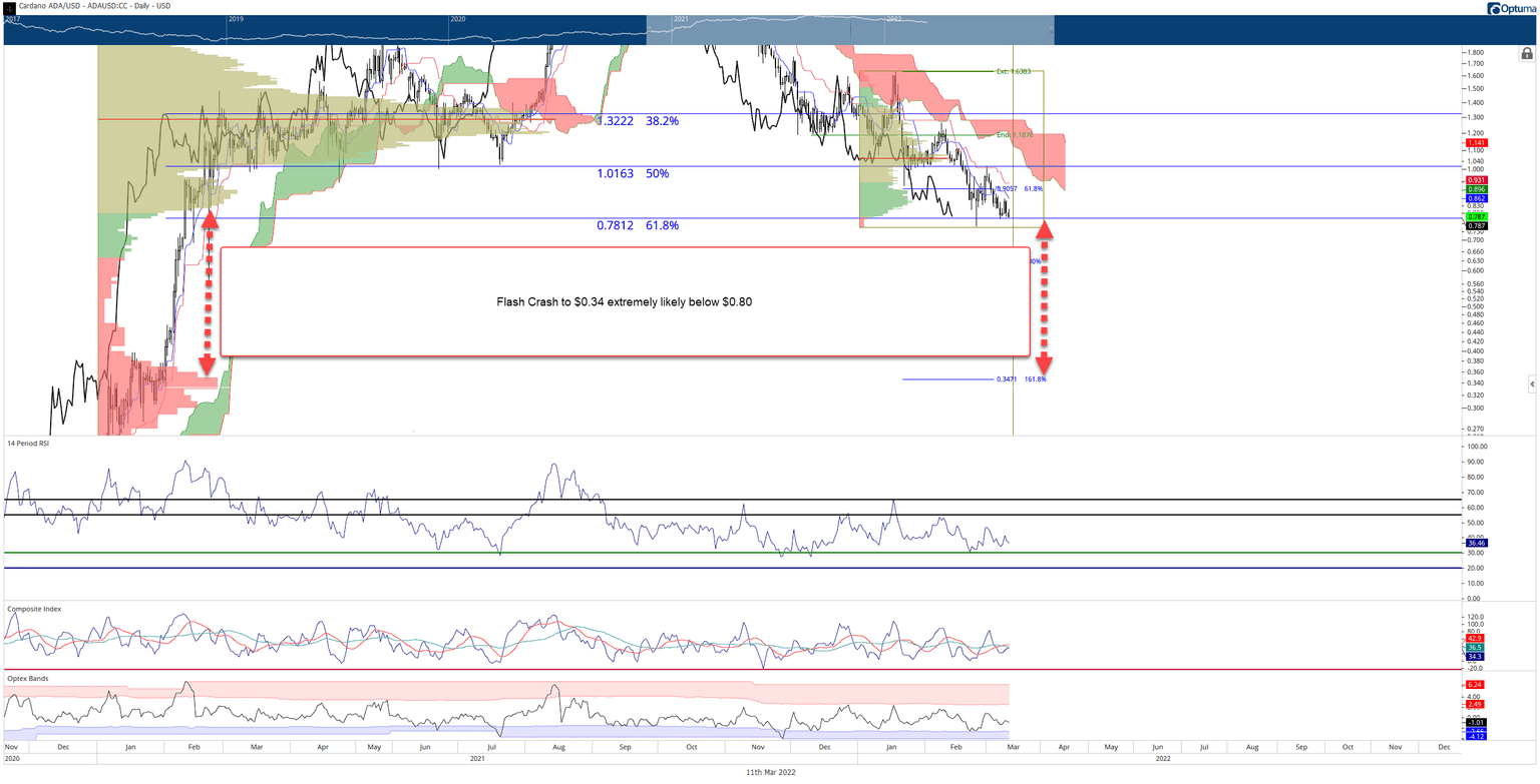 The only support on the daily chart remaining for Cardano price is the 61.8% Fibonacci retracement at $0.78. If that fails, then look out below. The extended 2021 Volume Profile shows a near-total absence of volume between $0.35 and $0.80. Already, ADA is in a position that could trigger an immediate flash crash to the $0.35 value area.