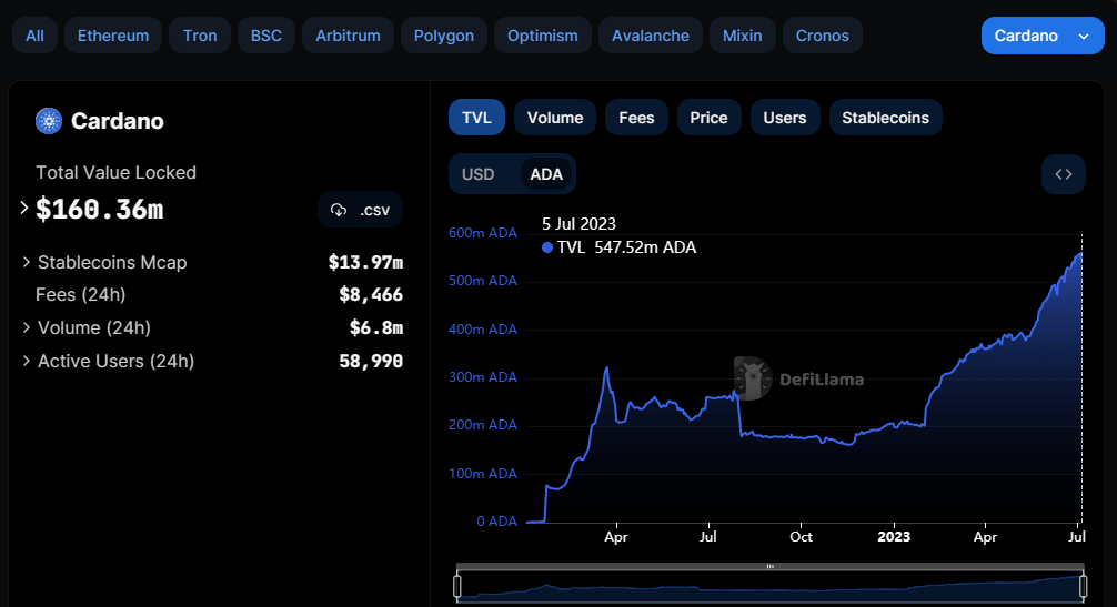 According to data on DeFiLlama, TVL is 547.52 million ADA, marking a new all-time high. Cardanofeed.com attributes this surge to a growing interest in Cardano's decentralized finance (DeFi) ecosystem among investors and market players in general.