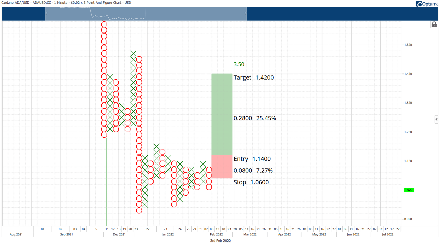 A hypothetical long entry now exists on the Point and Figure chart of Cardano price. The entry is a buy stop order at $1.14, a stop loss at $1.06, and a profit target at $1.42. In addition, the entry is based on an Ascending Triple Top pattern, where the entry coincides with a breakout above the upper part of the ten-day trading range.