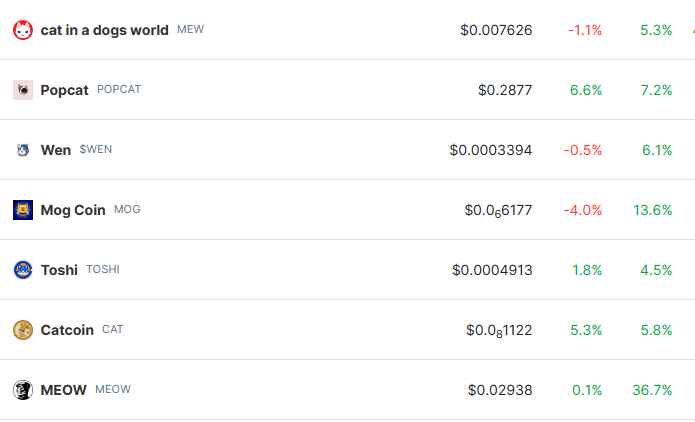 Cat-themed tokens are rallying, with some posting double-digit gains as the Bitcoin price continues to struggle. Among them, Cat in a dogs world (MEW), Popcat (POPCAT), and Wen (WEN) prices are up by an average of 6%, while others like Mog Coin (MOG), Real Smurf Cat (SMURFCAT) and Ansem’s Cat (HOBBES) are leading the sector.