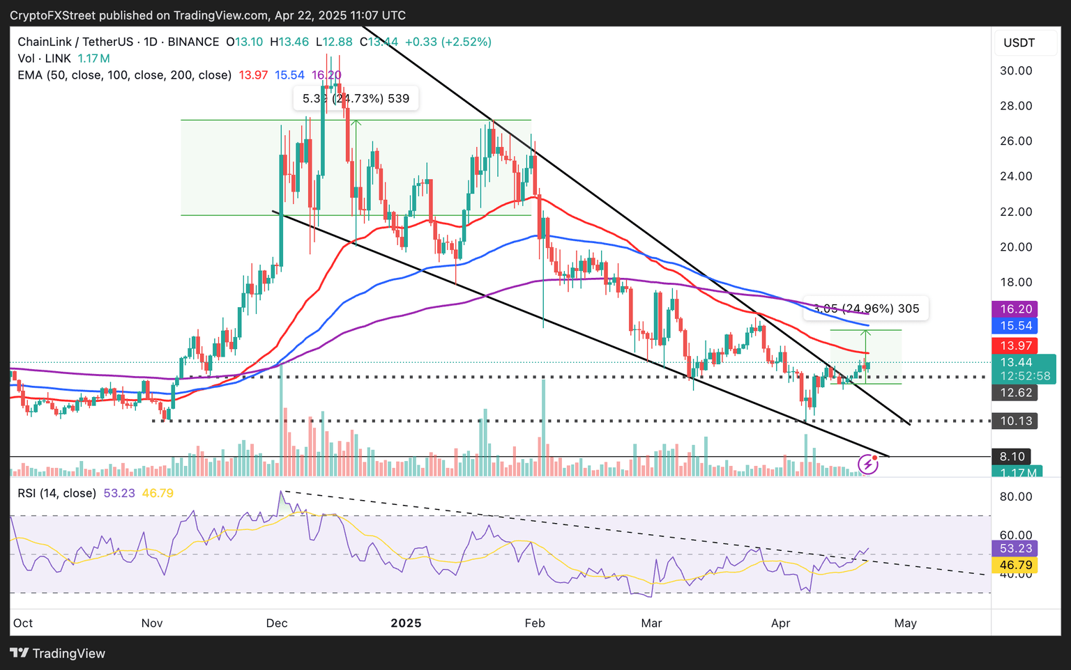 Chainlink (LINK) price increases almost 3% on Tuesday to exchange hands at $13.47 at the time of writing. The oracle token, which has recovered 31% from $10.13 – the lowest year-to-date price seen on April 7 –, looks set to uphold its recent uptrend amid rising exchange outflows and a favourable technical setup. Still, the path beyond the $14 level looks more complicated due to the presence of strong resistance clusters.