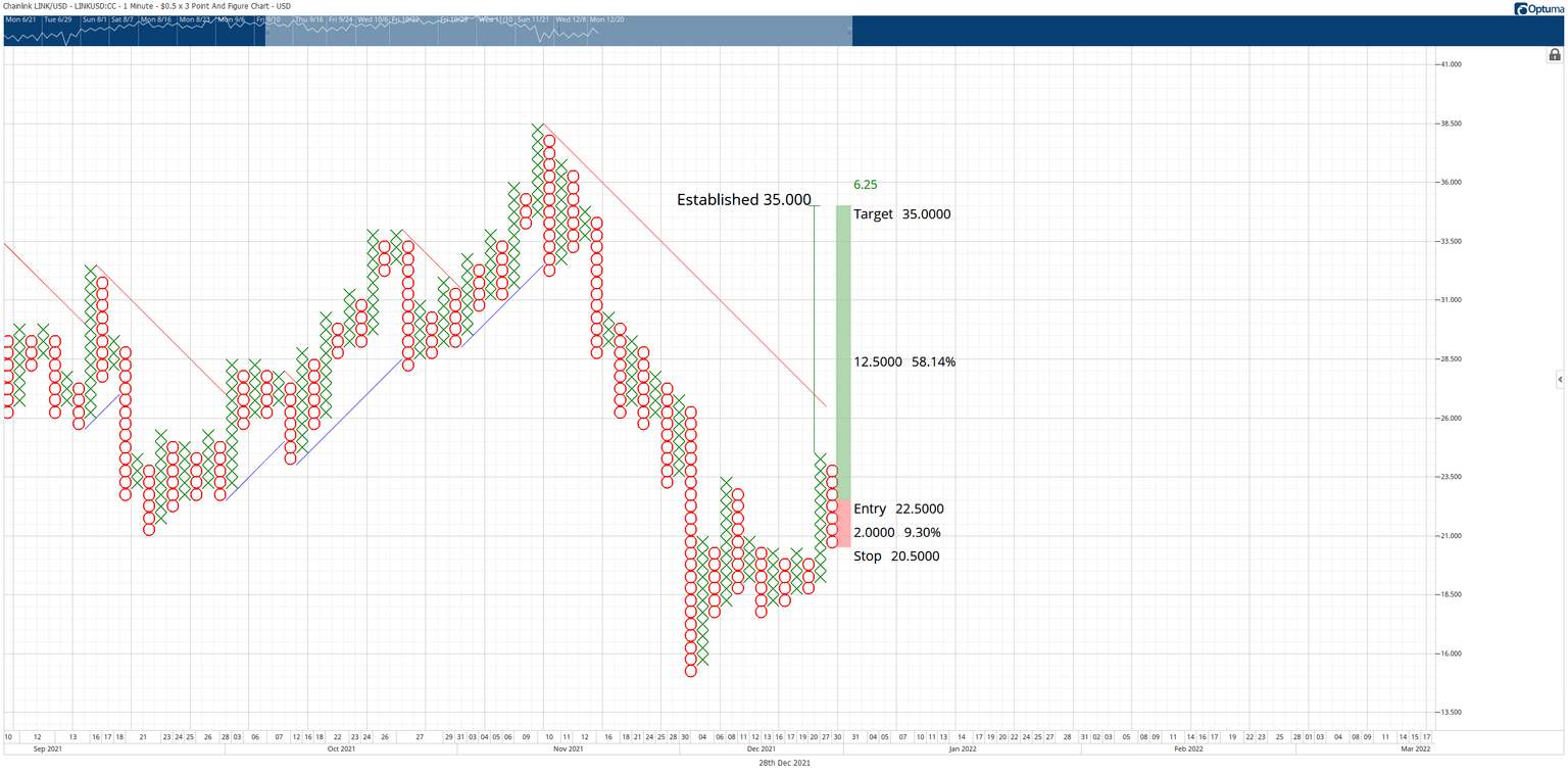 The entry rule on a Pole Pattern that has made its retracement is to enter on the 3-box reversal with a 4-box stop loss. At the time of publication, the hypothetical long setup for Chainlink price is a buy stop order at $22.50, a stop loss at $20.50, and a profit target at $35.00. This trade setup provides a 6.5:1 reward for the risk trade setup.