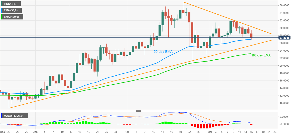 LINK sellers keep the reins while fading the latest corrective pullback from $26.81 around $27.65 during early Tuesday. In doing so, the cryptocurrency pair attacks 50-day EMA amid bearish MACD.