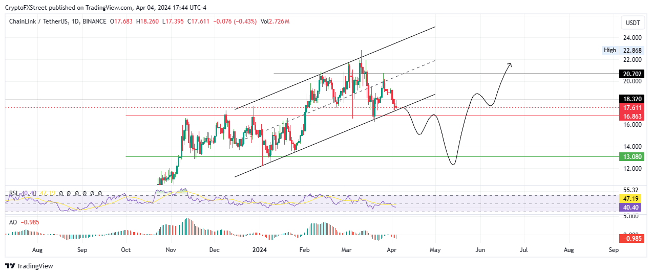 - Chainlink price is trading within the lower segment of the ascending channel, thinly holding above $16.86.