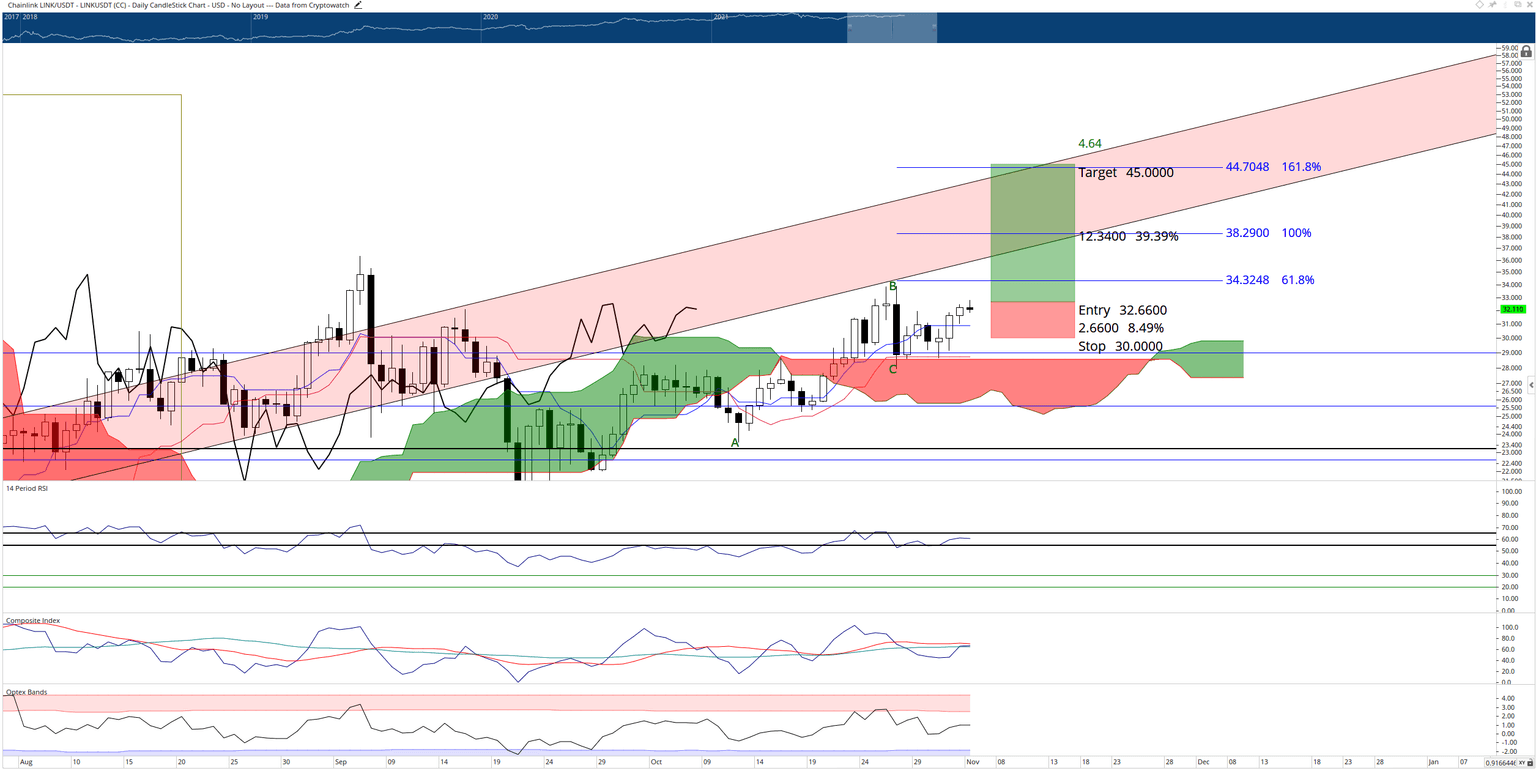 A hypothetical long trade for Chainlink price would be a buy stop when the daily close is slightly above the most recent swing high-close of $32.56, with a stop loss at $30.00 and a profit target at $45. $45 is the 161.8% Fibonacci expansion of the October 12th low to the October 27th high. Additionally, $45.00 is the top of the prior bear flag channel from June 2021 – which has acted as a primary resistance level for the remainder of 2021.