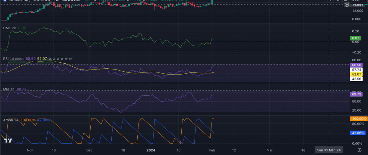 Confirming the strength of the current uptrend, LINK’s Aroon Up Line (orange) was at 100% at the time of writing. An asset’s Aroon Indicator measures the strength of its trend and identifies reversal points. When an asset’s Aroon Up line is close to 100%, it indicates that the uptrend is strong and that the most recent high was reached relatively recently.