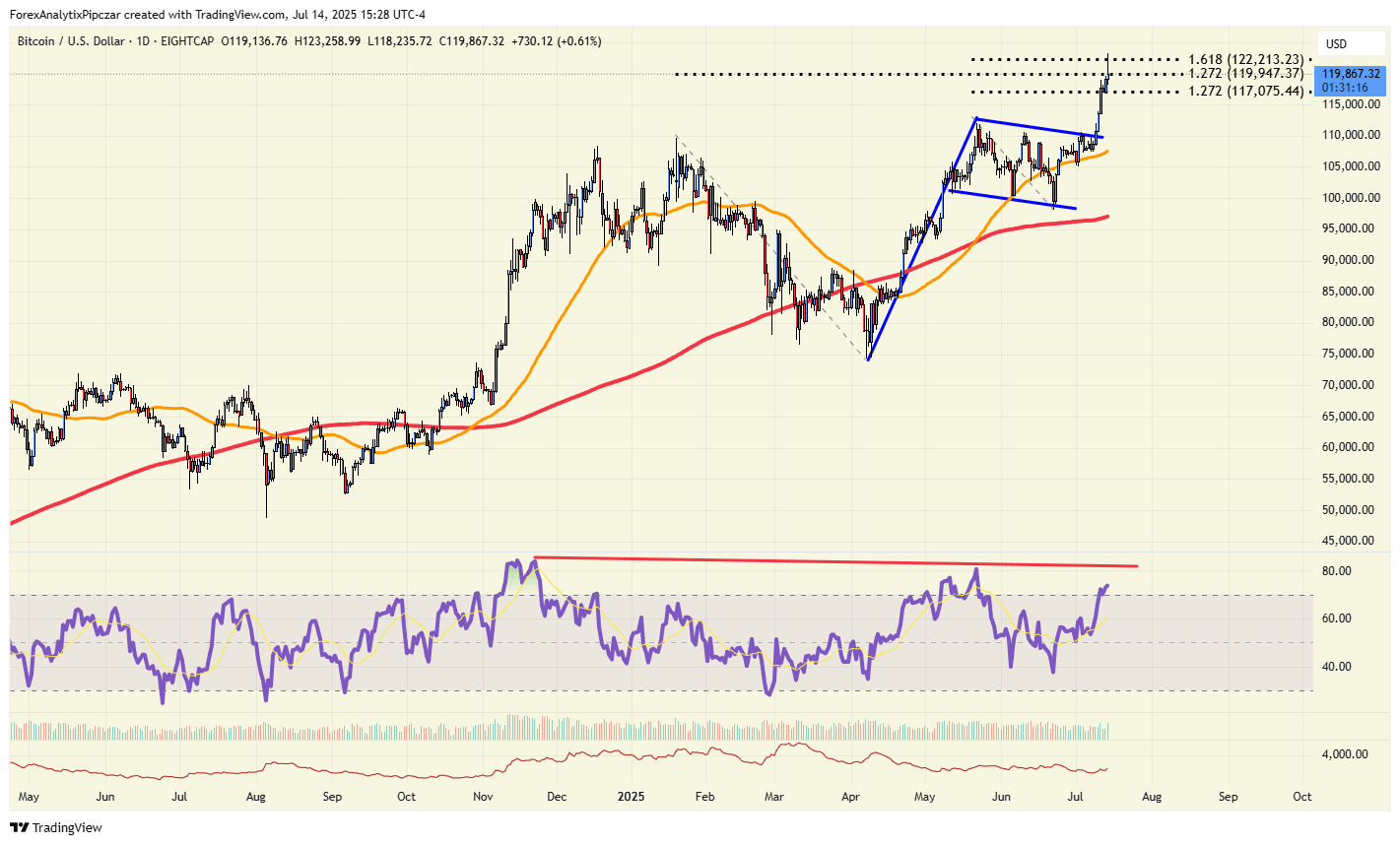 Technically, Bitcoin is probing some key resistance today. It's stalled by the 161% Fibonacci extension of the recent early May highs to June lows. More importantly is the 127% extension of the January highs to April lows. RSI is very divergent as price hits new highs. And with sentiment at near extremes, bulls should be careful now. And a break back below the 112k level would be a very bearish "topping pattern" event.