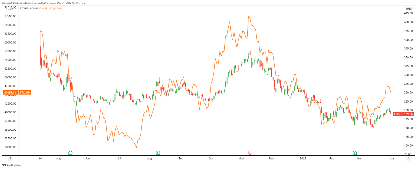 Both Coinbase and Bitcoin reached their peaks in November 2021. Bitcoin traded near $70,000 at the time but has since fallen to around $45,000 in recent months as traditional investors appear to shun digital assets.