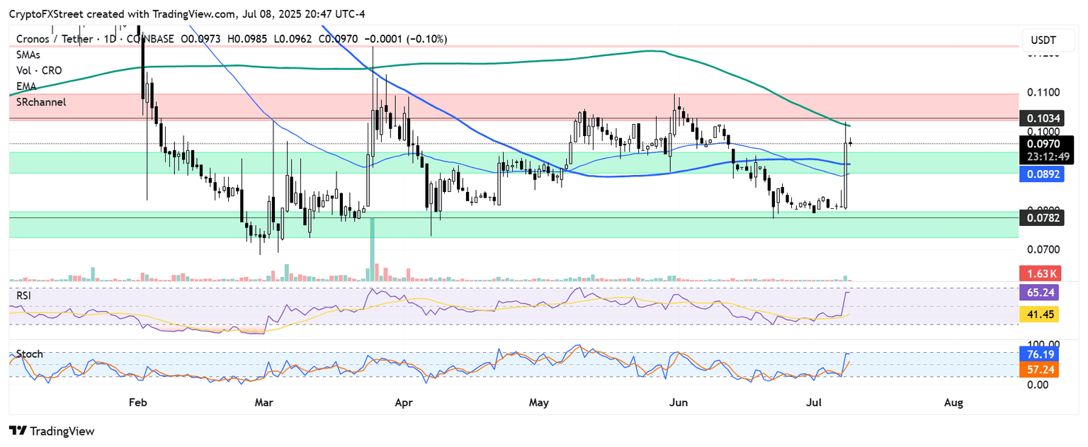 - CRO is up over 20% in the past 24 hours but faces at the $0.100 psychological level.