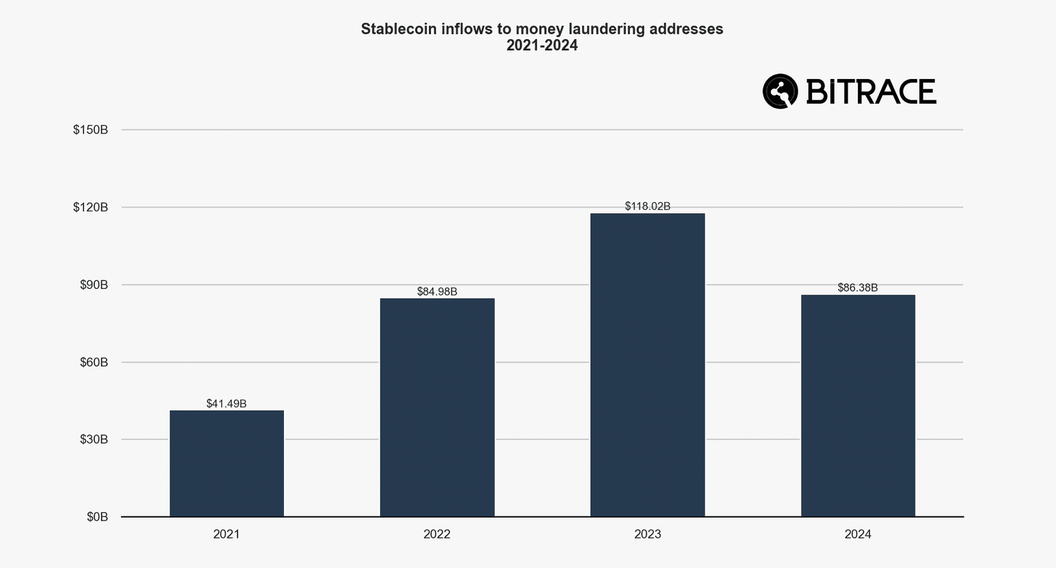 "In 2024, blockchain addresses linked to fraud activities experienced an explosive growth in stablecoin inflows, reaching USD 52.5 billion – exceeding the total of previous years combined," according to Bitrace's report.