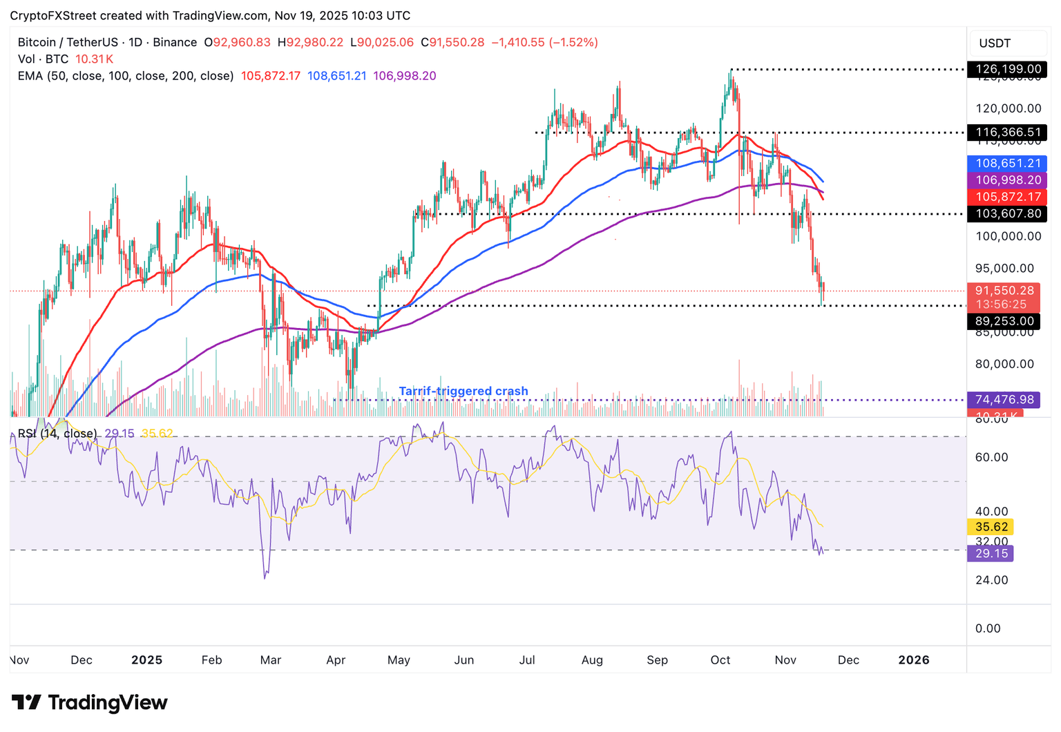 The Relative Strength Index (RSI) has entered the oversold region on the daily chart, indicating that bearish momentum is increasing. Lower RSI readings would reinforce Bitcoin's short-term bearish outlook, increasing the odds of a steady decline below $90,000.