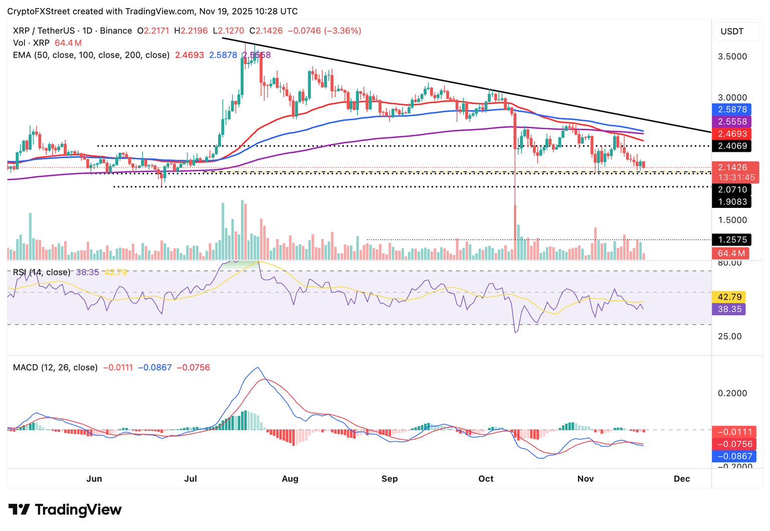 As for XRP, the price hovers above support between $2.07 and $2.10 at the time of writing on Wednesday as bulls struggle to gain control. The RSI is at 38 and falling toward oversold territory on the daily chart, which affirms the bearish outlook is showing early signs of stability.