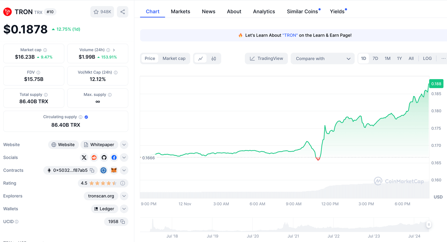 Tron (TRX) price action, November 12, 2024 | Source: CoinmarketCap