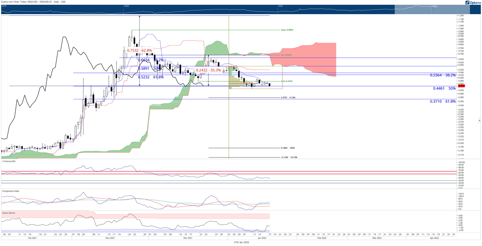 Significant support exists at the $0.45 price level with the 2022 Volume Point Of Control and the 50% Fibonacci retracement in that value area. However, within the Ichimoku Kinko Hyo system, Crypto.com price is overwhelmingly bearish on the daily chart.