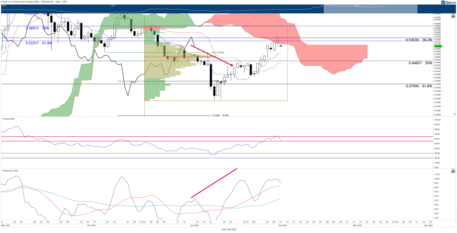 Crypto.com has a major cluster of resistance between $0.51 and $0.53. The 38.2% Fibonacci retracement (of this current downswing), the 61.8% Fibonacci retracement of the prior upswing) and the bottom of the Ichimoku Cloud (Senkou Span A) in the $0.51 to $0.53 price levels. It is the single most significant and most challenging resistance level on the daily Crypto.com chart.