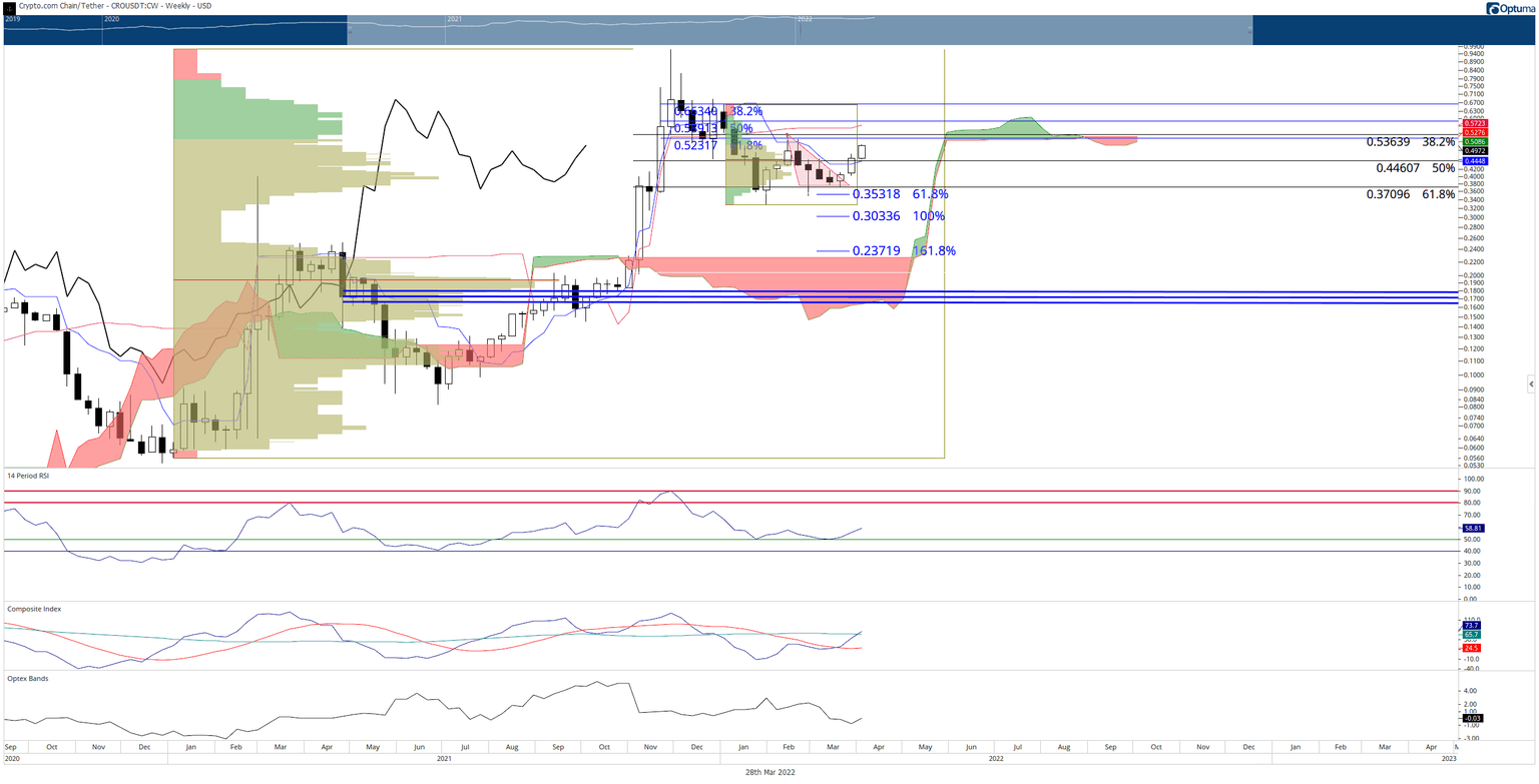 Last week’s close for Crypto.com price was above the Tenkan-Sen was the first since the week of December 24, 2021 – a very strong bullish signal for either a corrective move or a broader trend change. From an oscillator perspective, the Optex Bands oscillator is just turning up from all-time lows.