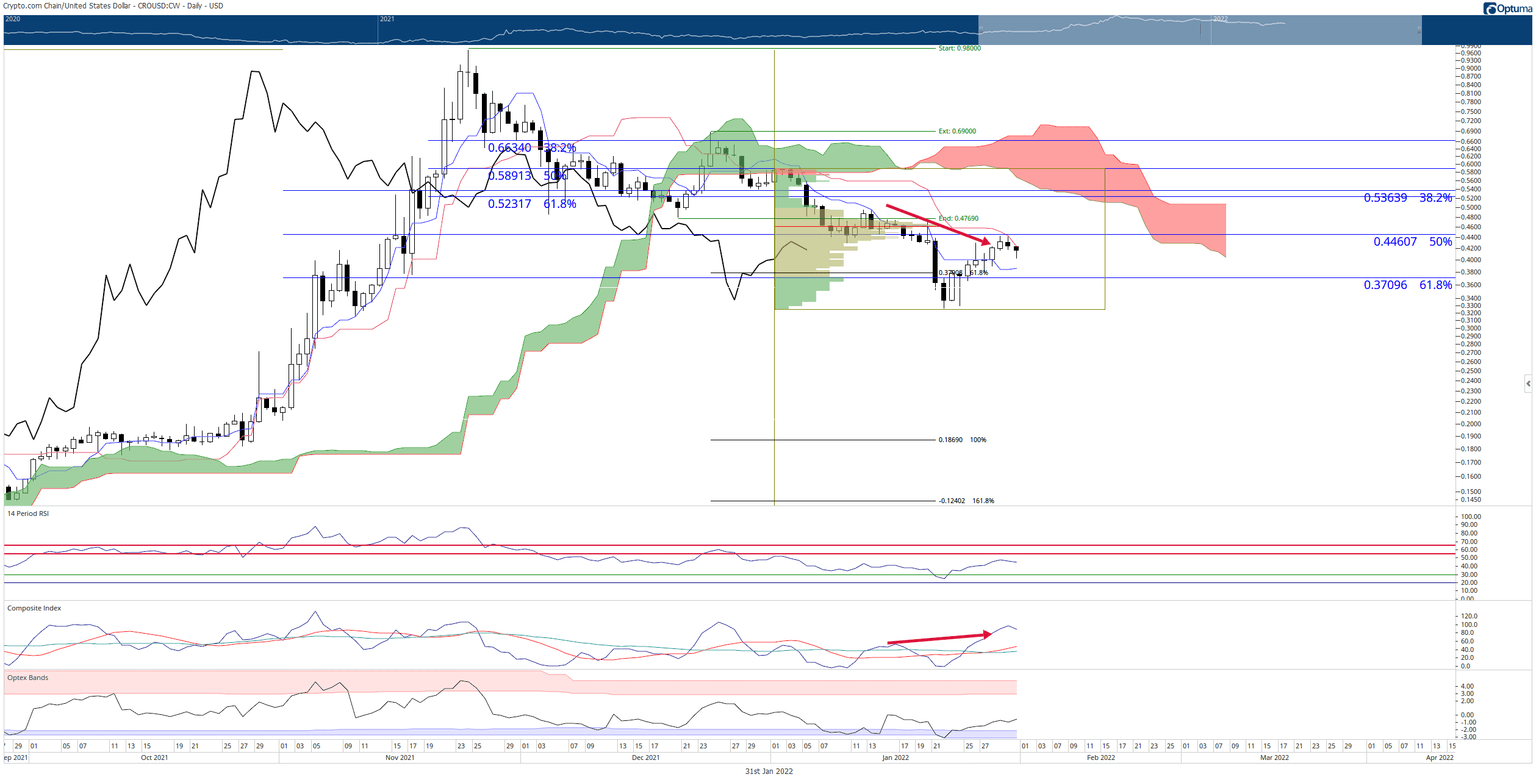 Crypto.com price has made a strong recovery over the past ten trading days. From the January 22 low of $0.33 to the January 29 swing high of $0.44, CRO has bounced nearly 36% higher. Crypto.com is still 28% above its most recent major swing low despite the selling pressure on Sunday and today's continued weakness.