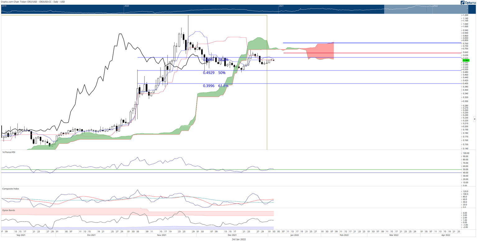 A clear bullish outlook within the Ichimoku Kinko Hyo system can only be achieved if CRO price has a close above the daily Cloud and weekly Tenkan-Sen at $0.81.