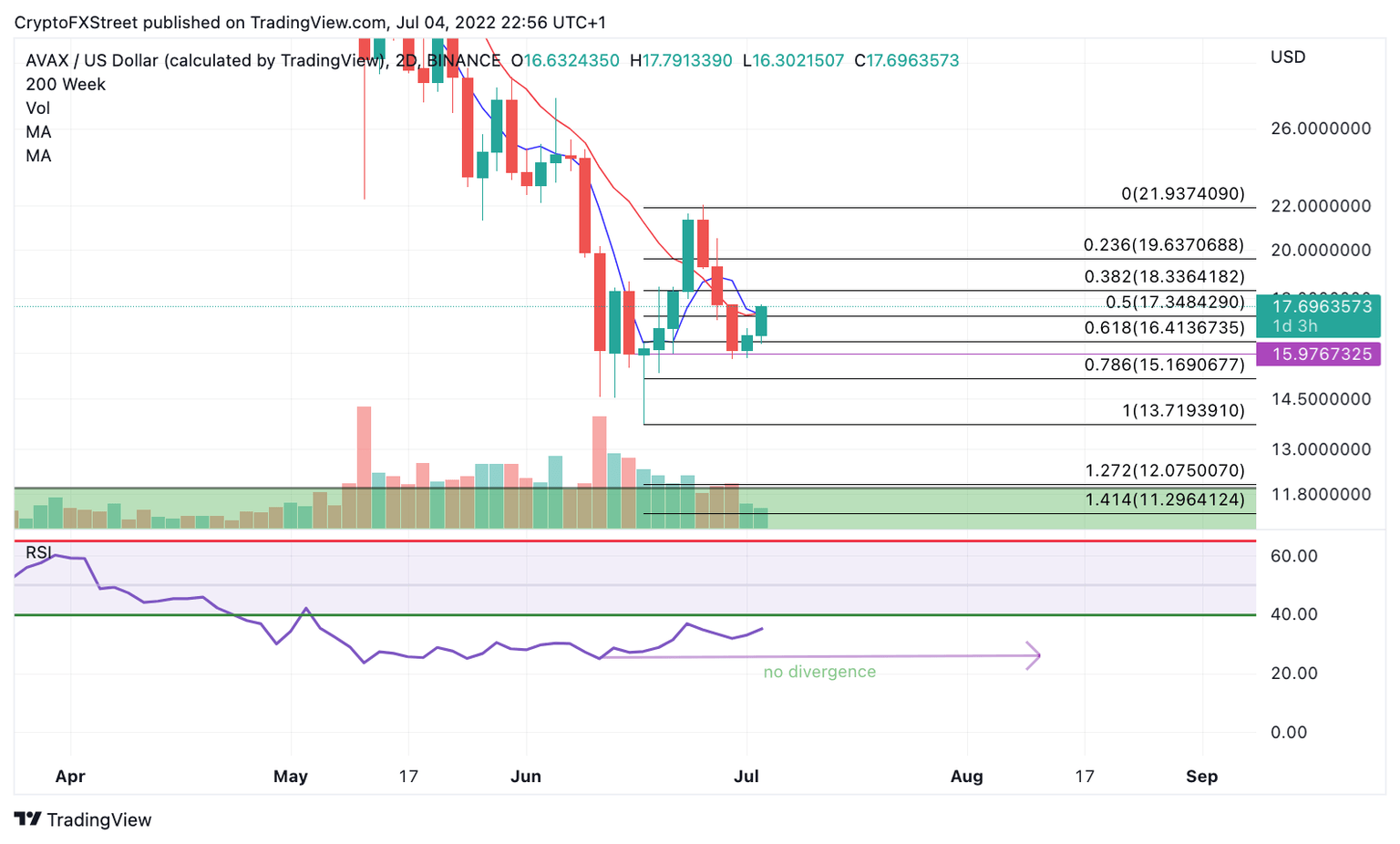 Avalanche’s AVAX price could endure another cataclysmic decline. Being an early buyer could be problematic. Avalanche’s AVAX price is showing signs of optimism amidst the brutal decline investors have been experiencing. On July 4, 2022, the AVAX price successfully retraced into a key 61.8% Fibonacci level at $17.41.