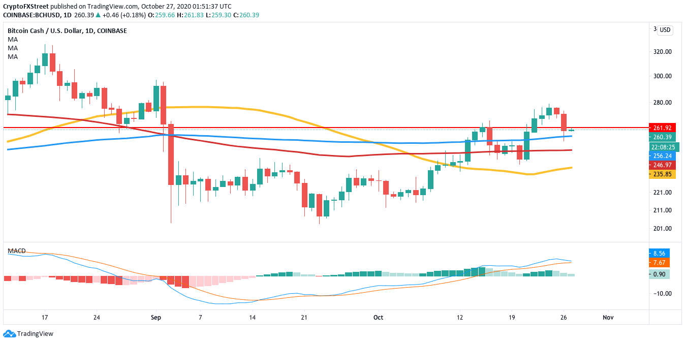 Bitcoin Cash found support at $240 and rose to $276 between October 21 and October 24. Since then, the price experienced a severe downturn as BCH plummeted to $260, as of press time. Further downward movement will probably be inhibited by the 100-day SMA ($256.25), 200-day SMA ($247) and 50-day SMA ($236).