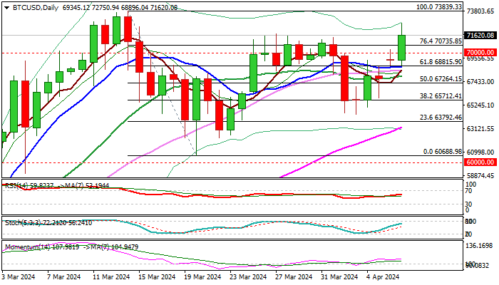 Bitcoin surged almost 5% on Monday and rose to the highest since March 14, after fresh bulls cleared psychological $70000 level and Fibo barrier at $70735 (76.4% retracement of $73839/$60688 correction).