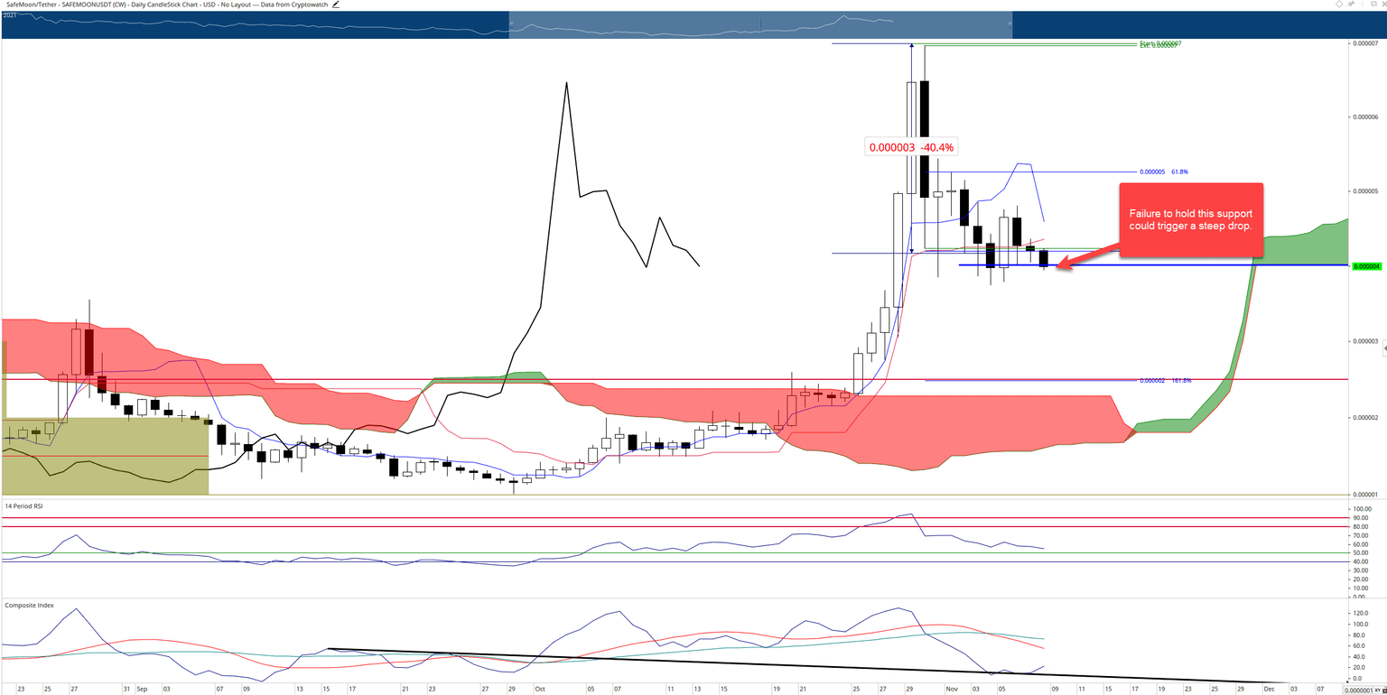 SafeMoon price struggles to establish a clear floor after pulling back nearly 50% from the all-time highs it established in late October. Last Friday showed some evidence that a continuation move higher may occur, but that quickly fizzled out.